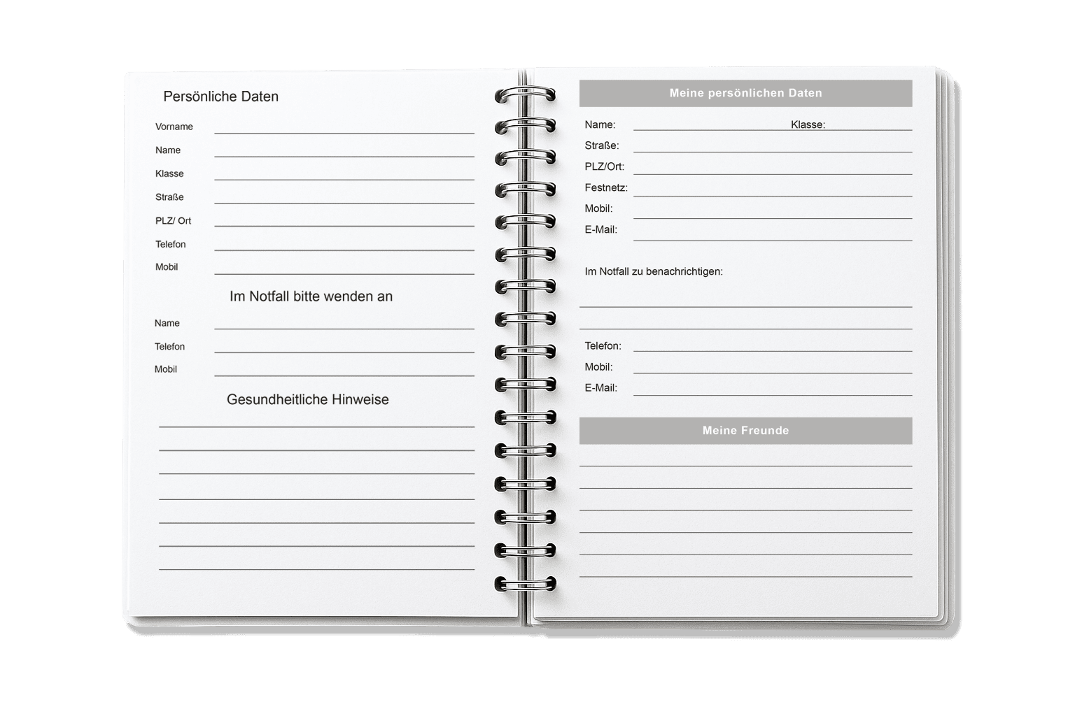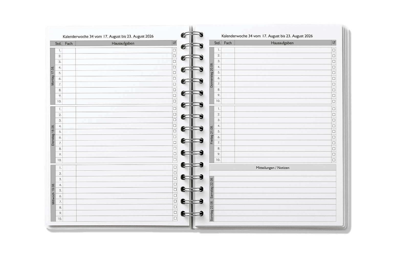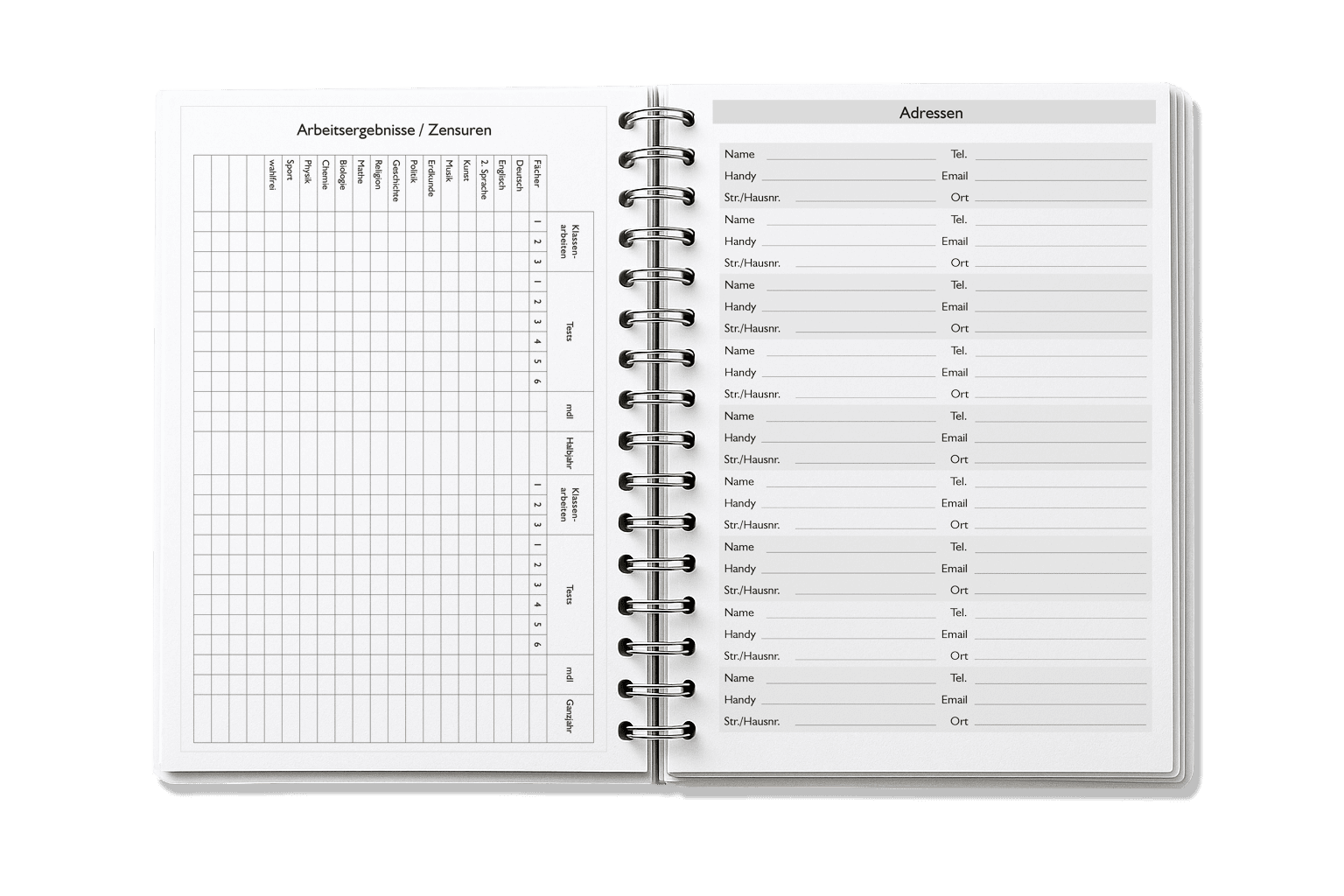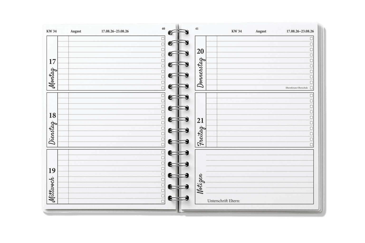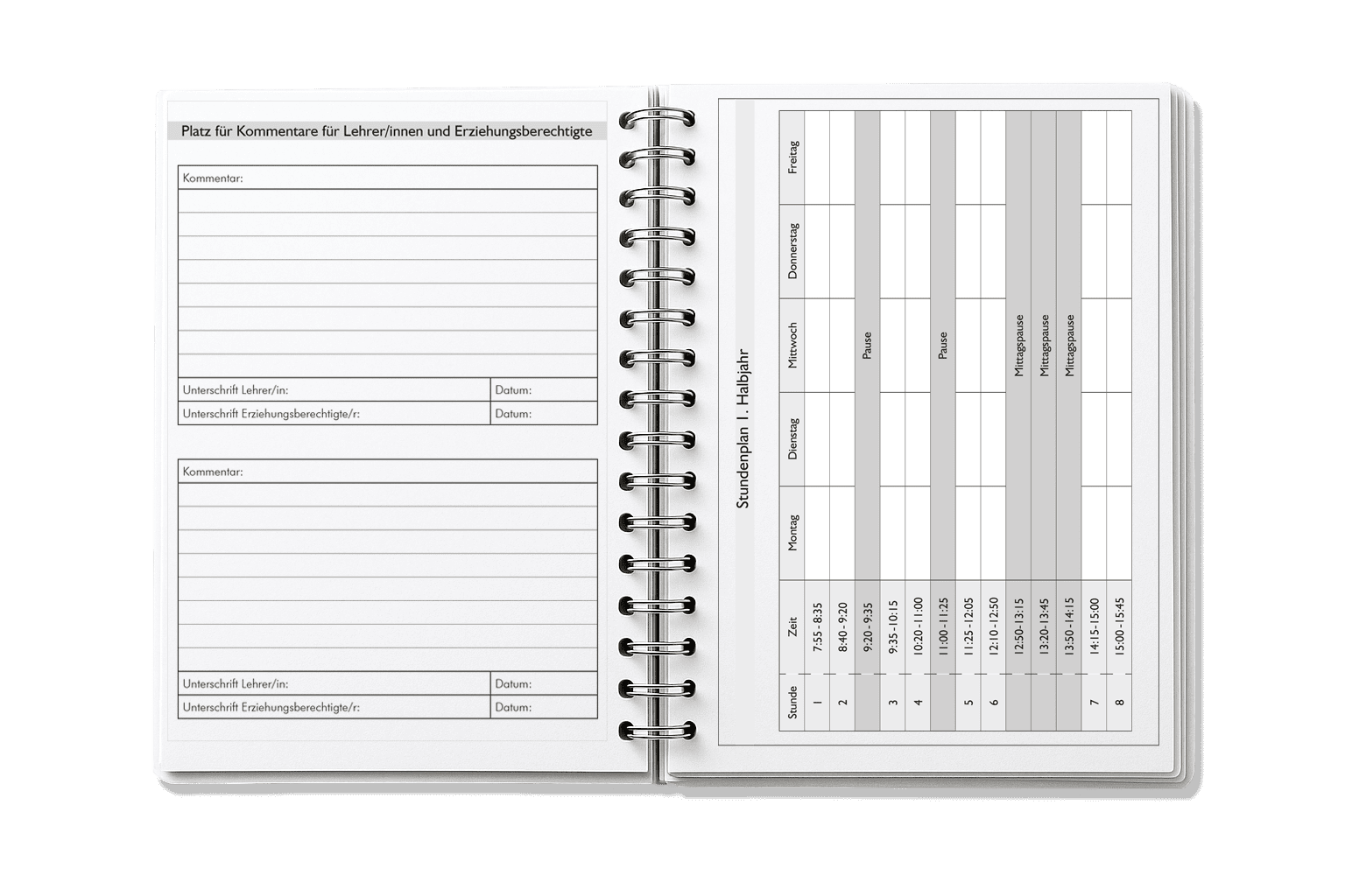 Wir gestalten jedes Layout ohne zusätzliche Kosten für Sie. Zudem erstellen wir für jede Schule maßgeschneiderte Vorlagen – vom Cover über Inhalts- und Monatsseiten bis hin zu Wochen- und Lernübersichten, exakt abgestimmt auf die individuellen Anforderungen und Wünsche Ihrer Schule.