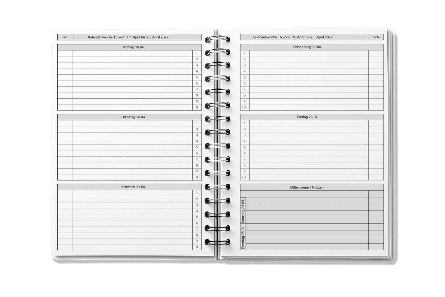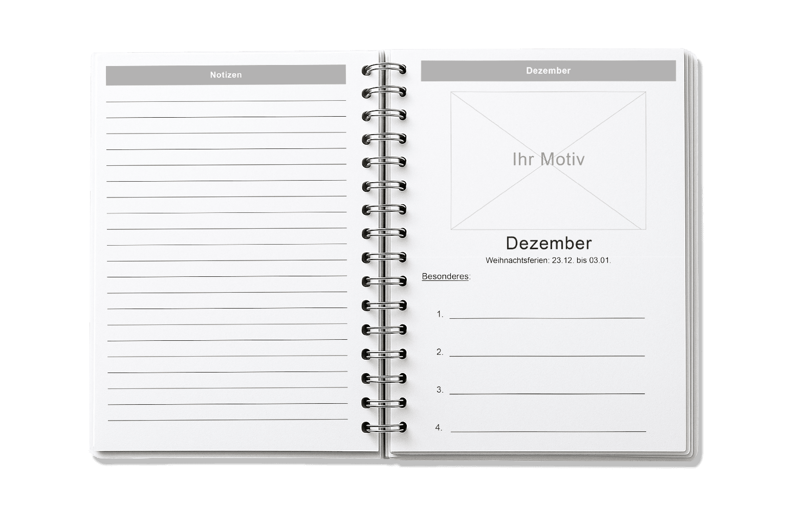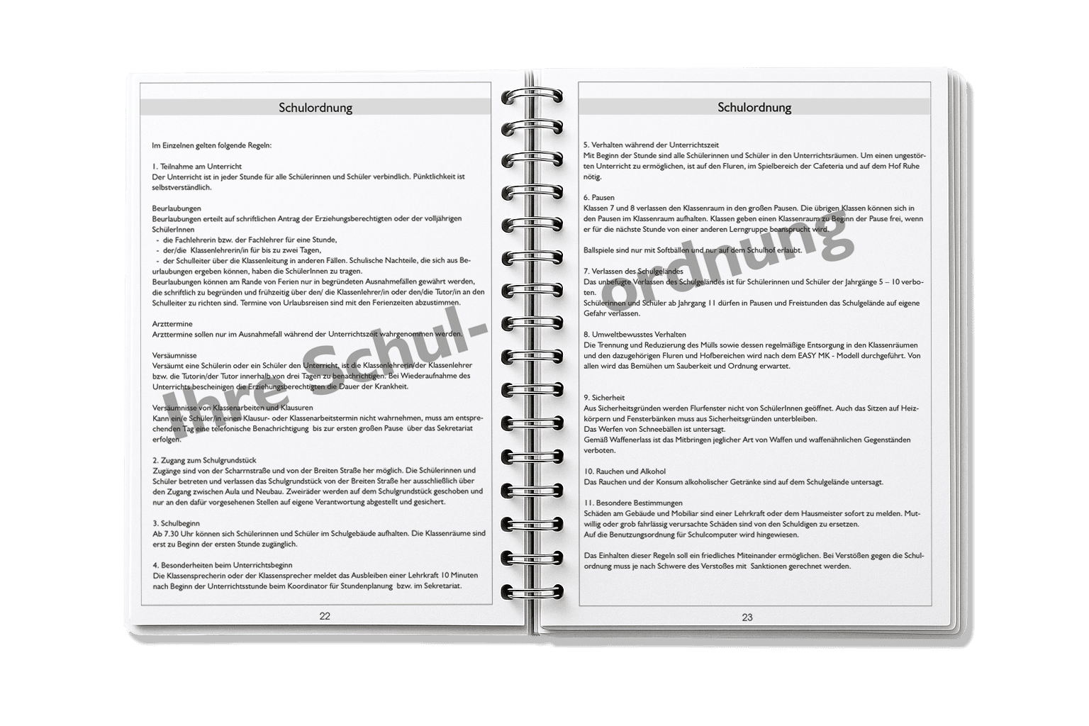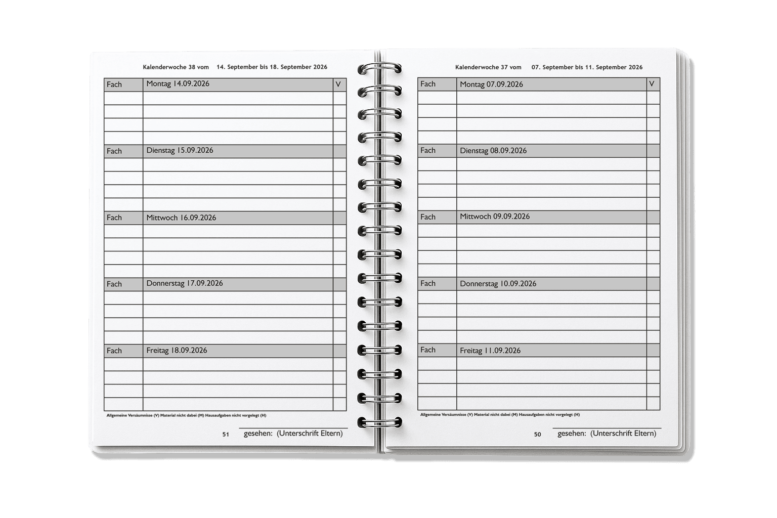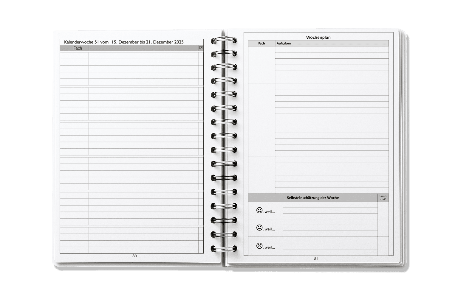 Wir gestalten jedes Layout ohne zusätzliche Kosten für Sie. Zudem erstellen wir für jede Schule maßgeschneiderte Vorlagen – vom Cover über Inhalts- und Monatsseiten bis hin zu Wochen- und Lernübersichten, exakt abgestimmt auf die individuellen Anforderungen und Wünsche Ihrer Schule.
